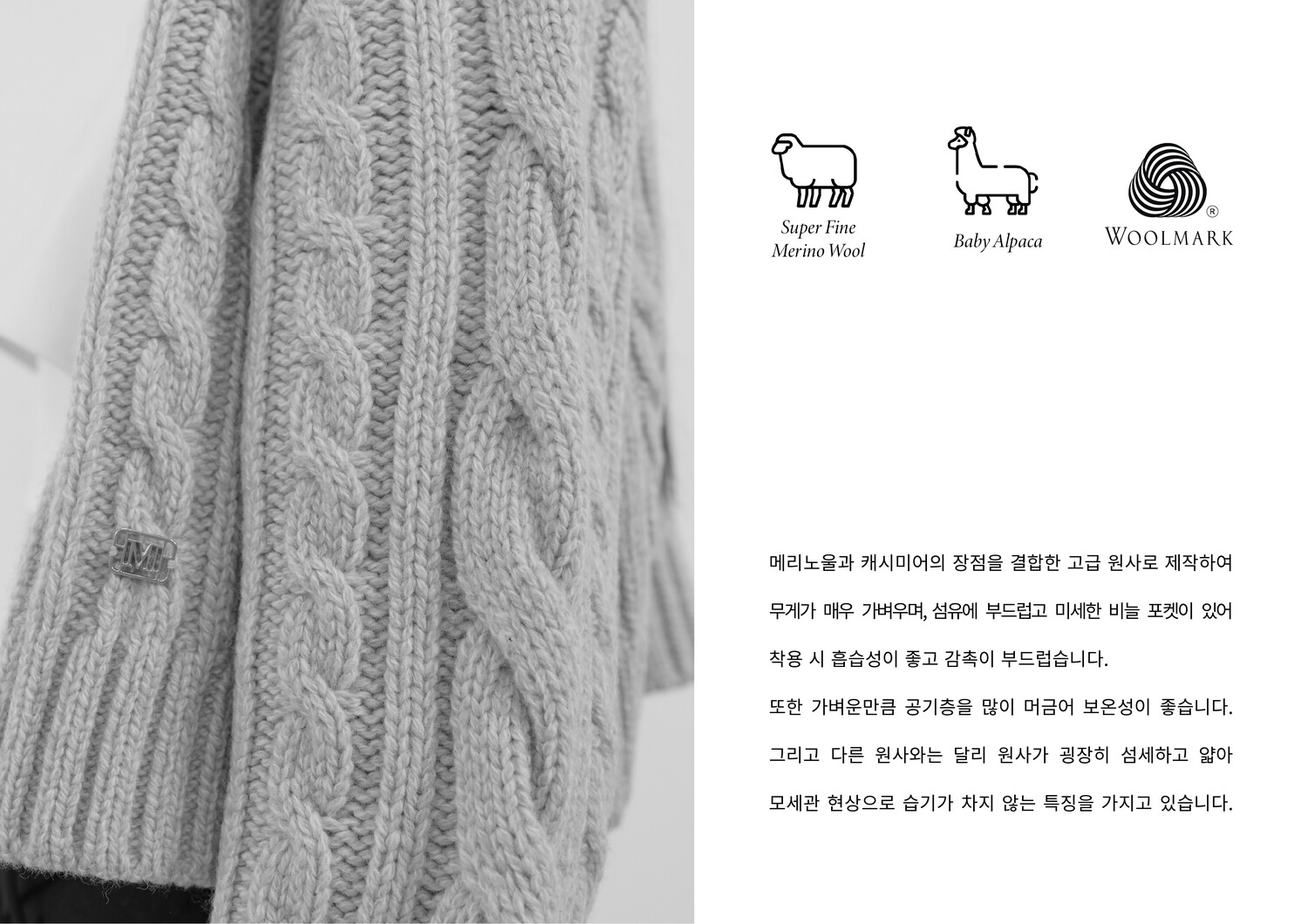 · 메리노울과 캐시미어의 장점을 가진 원사로 제작되어 가볍고 부드러우며 흡습성, 보온성이 뛰어남.